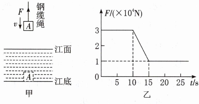 10. 图甲是修建码头时用钢缆绳拉着实心长方体$A$沿竖直方向匀速下降时的情景。图乙是$A下降到水底之前钢缆绳对A的拉力F随时间t$变化的图像(忽略空气阻力,$g取10N/kg$)。求: