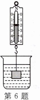 6. 如图所示,烧杯内盛有某种液体,把体积为$1×10^{-4}m^{3}$的铝块用细线系在弹簧测力计下浸没在液体中,静止时弹簧测力计的示数为$1.5N$,已知铝的密度为$2.7×10^{3}kg/m^{3}$。则铝块所受重力为
