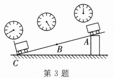 3. 如图为小明做“测量物体运动的平均速度”的实验过程,图中的秒表(秒表每格为1s)分别表示小车通过斜面 $ A $、$ B $、$ C $ 三点的时刻,点 $ B $ 是 $ AC $ 的中点。关于小车通过上、下半段路程所用的时间和平均速度的关系,正确的是(