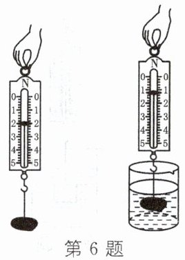 6. 用弹簧测力计可以测量石块受到的浮力,如图所示,小明用弹簧测力计测得石块在空气中受到的重力是$2.2N$,把石块浸没在水中称量时,弹簧测力计的示数是$1.2N$,则石块受到的浮力为(