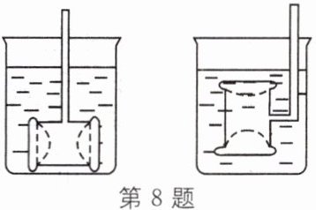 8. 如图所示,将两端蒙上绷紧程度相同的橡皮膜的玻璃圆筒浸没在水中,当玻璃圆筒沿水平方向放置时,水对玻璃圆筒两端的橡皮膜的压力$F_{向左}和F_{向右}的大小关系是F_{向左}$