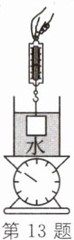 13. 在台秤上放半烧杯水,台秤的示数为$20N$,再将重为$7N$的金属块挂在弹簧测力计下,当金属块全部浸入水中时,如图所示,弹簧测力计的示数为$5N$,此时台秤示数为