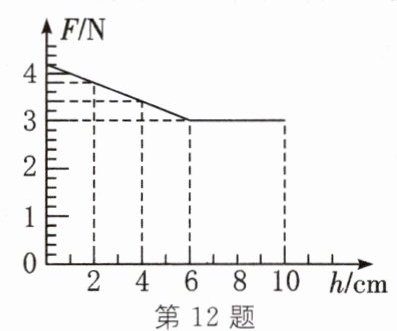 12. 如图是圆柱体物块从水面缓慢浸入水中时,根据实验数据描绘出弹簧测力计示数$F随物块浸入深度h$变化的关系图像。分析图像可得:当物块没有浸没之前,$h$增大时,弹簧测力计示数