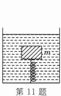 11. 如图所示,弹簧上端与物块 $ m $ 相连接,下端固定在容器底部。当物块浸没在水中静止时与物块浸没在酒精中静止时,弹簧的弹力大小相等。物块的体积为 $ 100cm^{3} $,酒精的密度为 $ 0.8×10^{3}kg/m^{3} $(不计弹簧质量及体积)。下列说法正确的是(