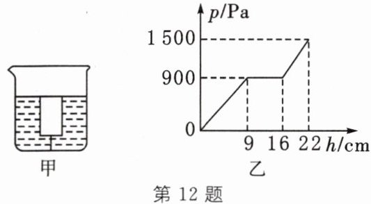 12. 将一底面积为 $ 0.01m^{2} $ 的长方体木块用细线栓在一个空容器的底部,然后向容器中缓慢加水直到木块上表面与液面相平,如图甲所示。在整个过程中,木块底部受到水的压强随容器中水的深度的变化如图乙所示,细线的长度为