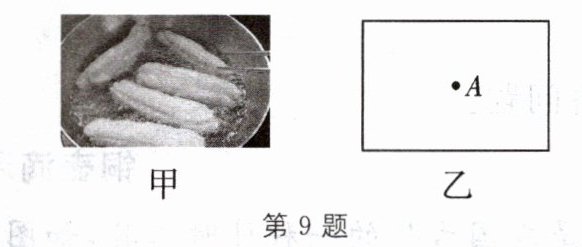 9. 如图甲所示,炸油条时油条先沉底后上浮至油面,请你帮助小明同学在图乙中$A$点,分析画出油条在上浮过程中受到的力。(不计油的阻力)