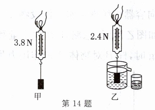 14. 某实验小组利用弹簧测力计测量小石块受到的重力,如图甲所示,将小石块浸没在水中,弹簧测力计示数如图乙所示,则小石块受到的浮力为