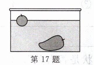 17. 小京洗水果时,发现体积较小的橘子漂浮在水面上,而体积较大的芒果却沉在水底,如图所示。则橘子的密度
