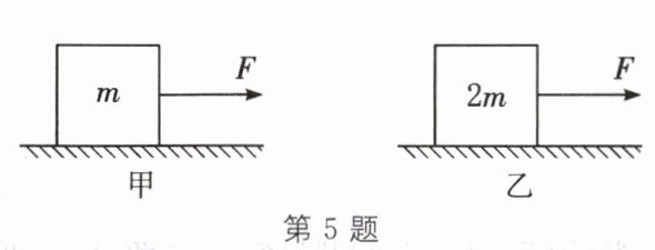 5. 如图所示,图甲中地面粗糙,图乙中地面光滑。两个质量分别为 m 和 2m 的物体在恒力 F 作用下,图甲中的物体做匀速直线运动,图乙中的物体做加速直线运动。两物体在力的方向上前进了相同的距离,力 F 做的功分别为 $W_{甲}$、$W_{乙}$,则下列结论正确的是(