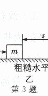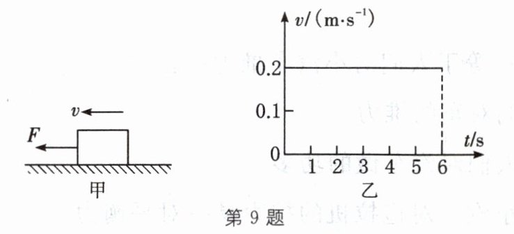 9. 如图甲所示,一木块放在平板上,在水平方向拉力 $F = 3$ N 的作用下,沿水平方向做匀速直线运动,木块运动速度 v 与时间 t 的关系如图乙所示。则木块受到的摩擦力为