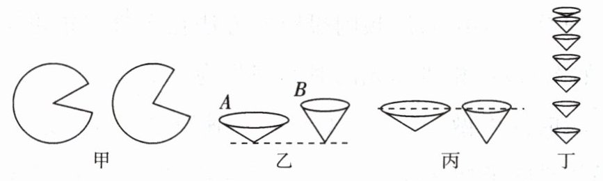 15. 在“测量纸锥下落的平均速度”的活动中。将如图甲所示的两个等大的圆纸片,裁去一个扇形,做成如图乙所示的 $ A $、$ B $ 两个锥角不等的纸锥。