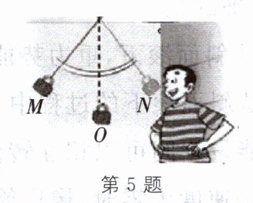 5. 如图所示,小强把一个铁锁用绳子悬挂起来,将铁锁拉到鼻子附近的$N$点,稳定后松手,铁锁来回摆动,$O$点是它摆动的最低点,$M$点是摆动到左侧的最高点,若小明不动,不计空气阻力,则下列说法错误的是(