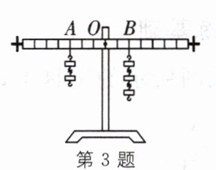 3. 如图所示,足够长的轻质杠杆在水平位置平衡,图中每个钩码的质量相等。若将悬挂点 $ A $ 点向左移动 $ 6 $ 格,为保证杠杆仍能在水平位置平衡,需将 $ B $ 点(