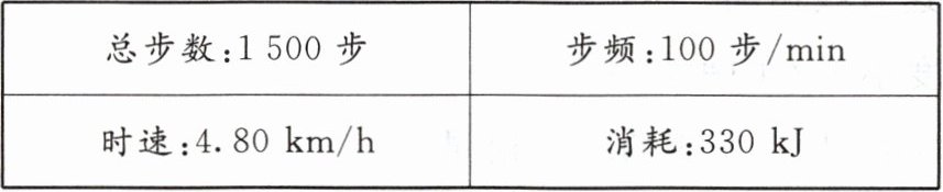 根据公式$t=\frac{N}{n}$($t$为时间,$N$为总步数,$n$为步频),可得$t=\frac{1500步}{100步/min} = 15min$。