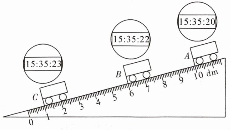 26. (12分)小明在“测小车的平均速度”的实验中,设计了如图所示的实验装置:小车从带刻度(分度值为1cm)的斜面顶端由静止下滑,图中的圆圈是小车到达A、B、C三处时电子表的显示,分别为A(15:35:20),B(15:35:22),C(15:35:23)(数字分别表示“小时:分:秒”)。