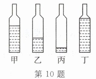 10. 用一组相同的瓶子盛上不等量的水就可以组成一个“乐器”,通过敲击瓶子就可以演奏出优美动听的乐曲。如图所示,四个相同玻璃瓶里装水,水面高度不同,敲击瓶子,则音调最高的瓶子是