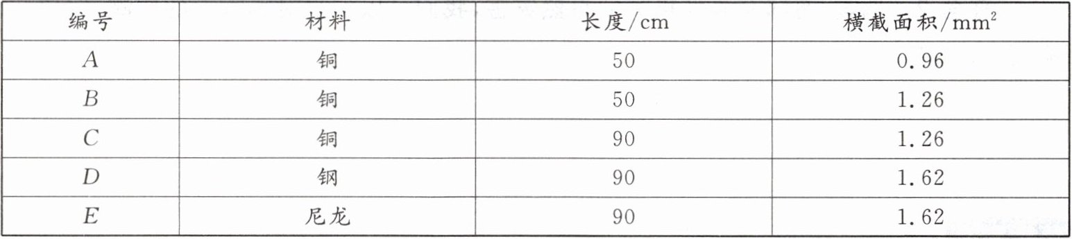|编号|材料|长度/cm|横截面积$/mm^2$|