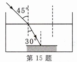 15. 如图所示,光线从空气射入某种液体中,入射角为45°,折射角为30°,光线射到液体底部水平放置的平面镜上又反射回来,最后光线又回到空气中的折射角是(