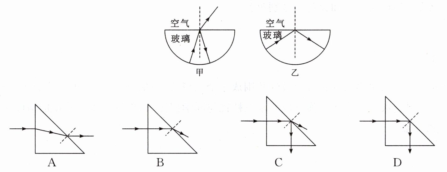 16. 小明在“探究光的折射规律”实验中发现:当光以较小的入射角从玻璃斜射向空气时,同时发生反射和折射现象,如图甲所示;但当入射角增大到41.8°时,空气中的折射光会突然消失,只有反射光,如图乙所示。现有一个玻璃制成的等腰直角三棱镜,一束光垂直于三棱镜的一个直角面射入,关于这束光经过三棱镜后的光路描述,下图中正确的是(