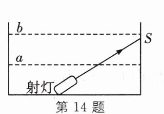 14. 学校新建一个喷水池,在池底的中央安装了一个射灯,池内无水时,射灯发出的一束光照在池壁上,在S点形成一个亮斑,如图所示。现在往池内注水,当水面升至a位置时,站在池旁的人看到亮斑的位置在P点,如果水面上升到b位置时,人看到亮斑的位置在Q点,则(