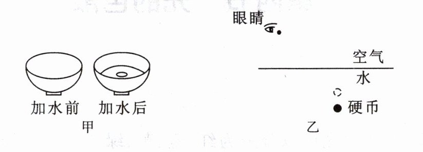 13. 如图甲所示,从侧面望去,碗是空的,但当慢慢往茶杯中倒水时,就会发现碗中原来还藏着一枚硬币。请在图乙中画出眼睛看到水中硬币的光学原理图。