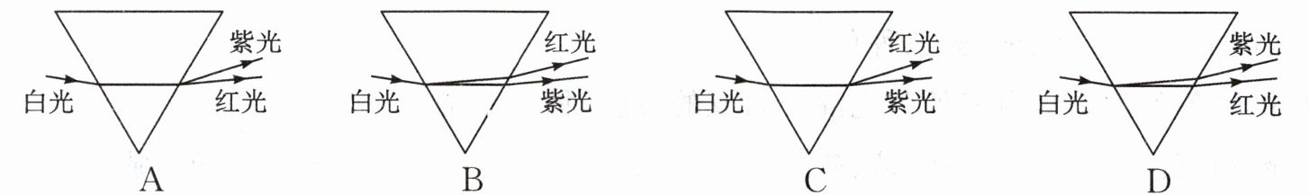 11. 三棱镜对不同色光的偏折不同,其中对红光的偏折最小,对紫光的偏折最大,以下示意图(光在三棱镜中传播方向的箭头和其他色光没有画出)正确的是(