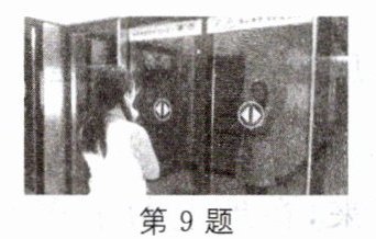 9. 如图所示,某市民正站在平面玻璃制的地铁安全门外候车。地铁到站后,安全门向两侧打开,该市民在左右两侧安全门中的情况分析正确的是(