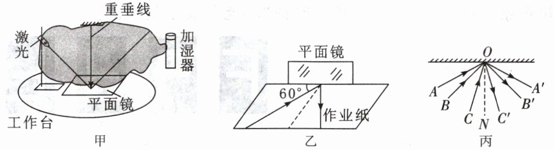 。(4)改变激光笔的位置,多次实验,在纸上画出入射光线和对应的反射光线,如图丙所示。不用量角器也能快速得出反射角等于入射角这一结论,你的操作是