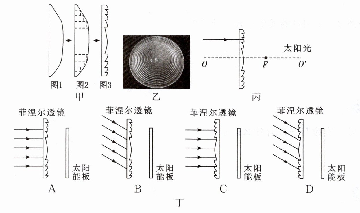 甲图中图1是平凸透镜的截面图,由光学知识可知,平行光由平凸透镜左侧垂直入射,在透镜中传播方向不变,只有经透镜另一侧曲面时才会发生偏折,并会聚于焦点。若在图2中将平凸透镜阴影部分去掉,保留图中曲面的白色部分并将其向左平移到透镜平面处,即为图3,这样的透镜叫做菲涅尔透镜(又称螺纹透镜)。菲涅尔透镜与平凸透镜一样,都能将平行于主光轴的光线会聚于焦点。与平凸透镜相比,菲涅尔透镜减少了光在透镜中直线传播的部分,只保留透镜发生折射的曲面,在节省透镜材料的同时也减少了光在透镜中传播的光能损失。菲涅尔透镜有着广泛的应用,如图乙为手机闪光灯上用到的菲涅尔透镜,从上方俯视,它由数个同心圆纹路的玻璃组成。大型菲涅尔透镜是聚光太阳能系统中重要的光学部件之一,它能提高太阳能板上单位面积获得的光能,如图丙所示,从上方垂直菲涅尔透镜的光束,在一半焦距处面积只有原来的四分之一。