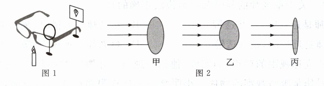 12. 小明进行“视力的矫正”探究活动,他将自己戴的近视眼镜放在蜡烛与凸透镜之间,如图1所示在光屏上得到了一个缩小、倒立的清晰实像,拿开眼镜后,光屏上的像变得模糊了。