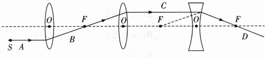 6. 如图所示,前后两块相邻透镜的焦点恰好重合,从光源$S$点向右发出一条与主光轴平行的光线,先后经$2$个凸透镜折射和一个凹透镜折射,在$A$、$B$、$C$、$D$四段光线中,其中描绘错误的是(