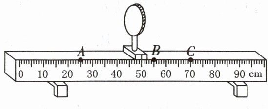 12. 在光具座的$A$点处放置一发光物体,从焦距$f_{甲}为5$cm、$f_{乙}为10$cm、$f_{丙}为20$cm的凸透镜中选择一个放置在如图所示的位置,在$BC$间移动光屏时可在光屏上得到清晰的像,则选择的凸透镜为(
