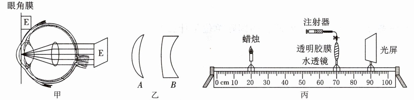 (2)小明用自制的水凸透镜(当向水凸透镜里注水时焦距变小,抽水时焦距变大)来模拟眼睛看物体的情景:他将蜡烛、水凸透镜和光屏调整至图丙所示的位置时,光屏上出现清晰的烛焰像,此像的性质是倒立、
