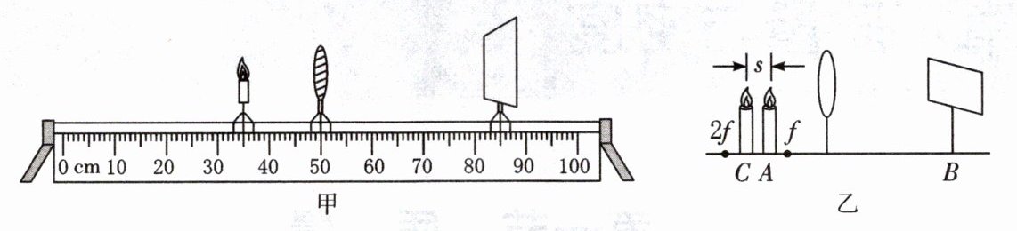 (3)如图乙所示,蜡烛在光具座上$A处向左移动距离s到C$,为在光屏上再次成清晰的像,则他应将光屏向左移动,光屏移动距离为$s'$