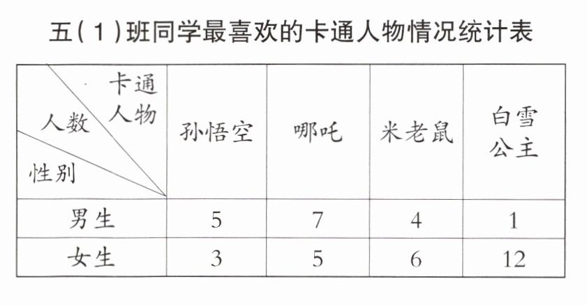 2. 下表是五(1)班同学最喜欢的卡通人物调查统计表。请根据统计表中的数据画出统计图,并回答下面的问题。