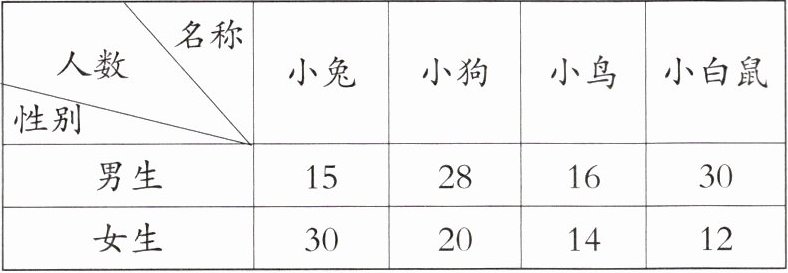 答:男生更喜欢小白鼠,女生更喜欢小兔喜欢小鸟的男女生人数接近。