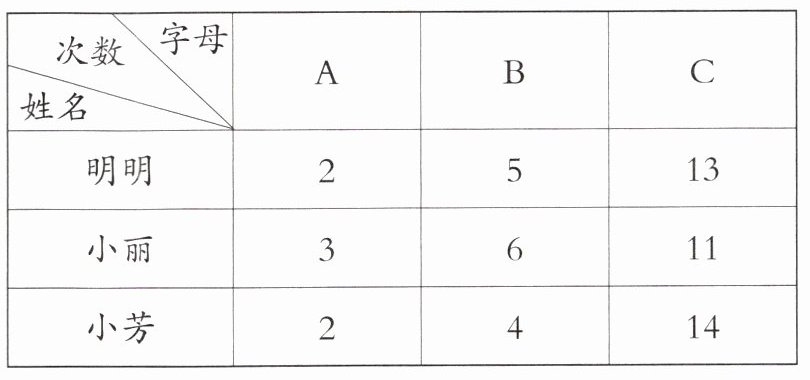 6. 有一个正方体木块,1面写着A,2面写着B,3面写着C。3名同学每人抛20次,统计情况如下。
