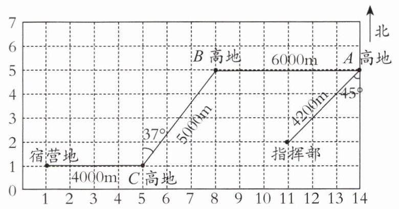 (2)从宿营地向东走4000m到达C高地,再向北偏东37°方向走5000m到达B高地。
