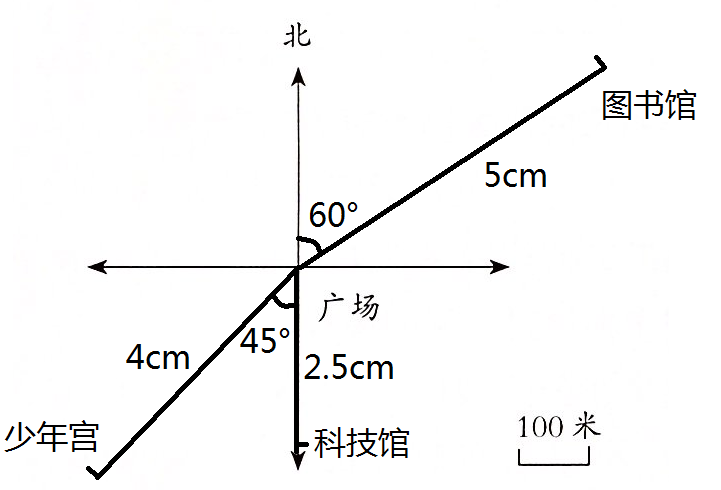 (2)少年宫在广场南偏西45°方向,距离广场400米处。