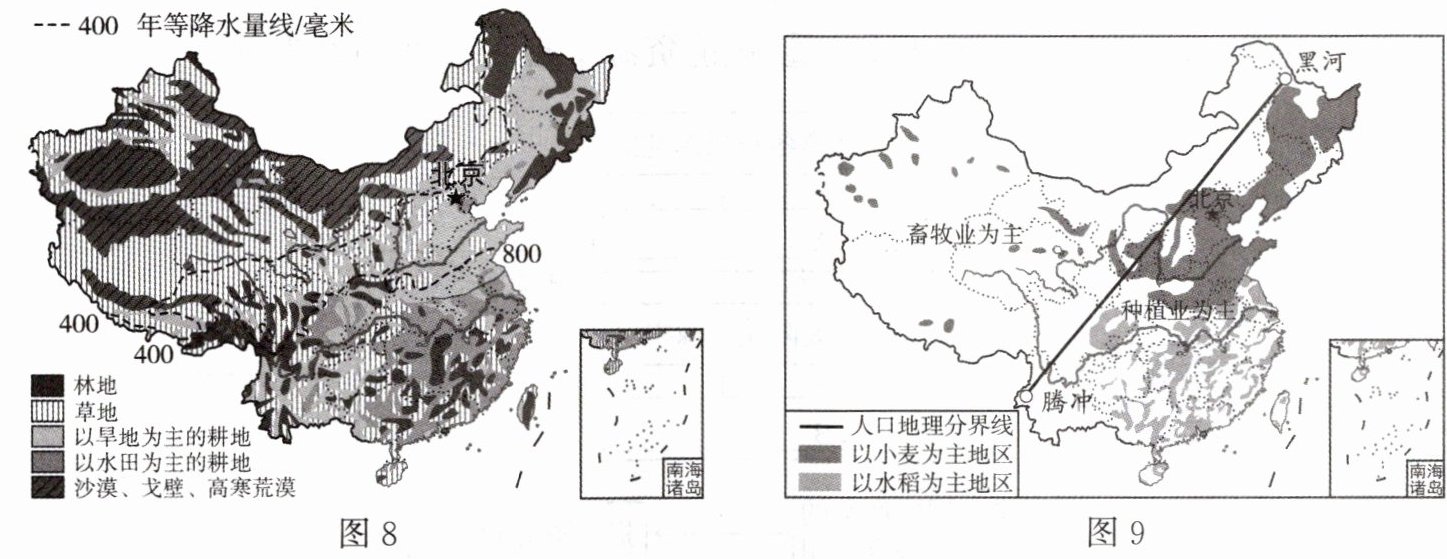 16. 图 8 是我国土地利用类型分布图,图 9 为我国主要粮食作物分布图。读图,完成下列各题。