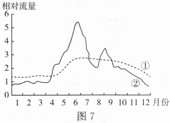 15. 图 7 中①②两条曲线为我国某河流修建水库前后的流量年变化曲线。下列叙述正确的是(