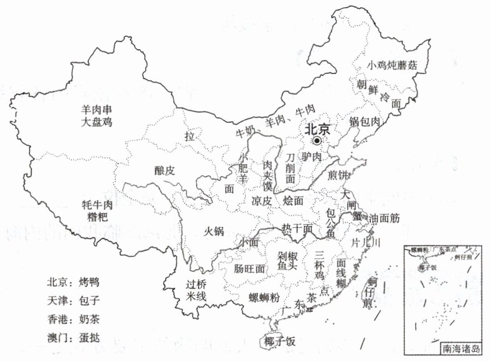 1. 图中“酿皮”“三杯鸡”“驴肉”“肠旺面”所在省级行政区的简称依次是(