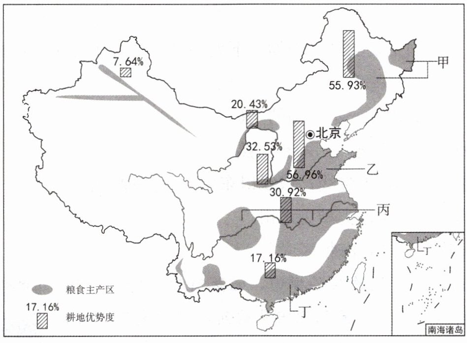 [思维过程]1. 甲产区位于东北地区,以温带季风气候为主,雨热同期,以种植春小麦为主;乙产区为华北平原产区,位于北方地区,地形平坦,以种植小麦为主;丙产区为四川盆地,人口稠密,人均耕地面积少;读图可知,耕地优势度北高南低,东高西低。2. 珠江三角洲耕地优势度低,即耕地面积占土地面积的比重小的主要原因是由于珠三角区经济较发达,城镇化程度高,城镇和工业用地多。