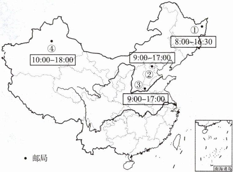 邮戳是邮局在信件、包裹上加盖的戳记,往往会结合地域文化景观设计纪念邮戳。右图为我国部分邮局的位置和营业时间示意图。读图,完成 6~7 题。