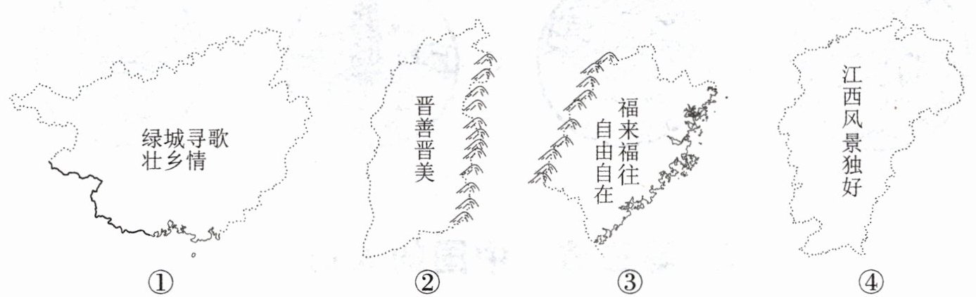 我国各省份的宣传语各具特色,反映出它们对自身特色的定位。下图中①②③④为四省份的轮廓图和宣传语。据此,完成 2~3 题。
