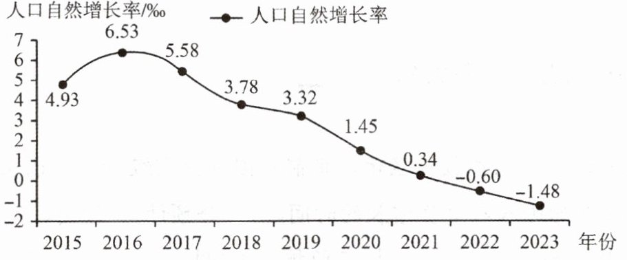 人口自然增长率的大小,是由人口出生率和死亡率决定的,它能表明人口自然增长的程度和趋势。下图为 2015—2023 年我国人口自然增长率变化曲线图。读图,完成 4~5 题。