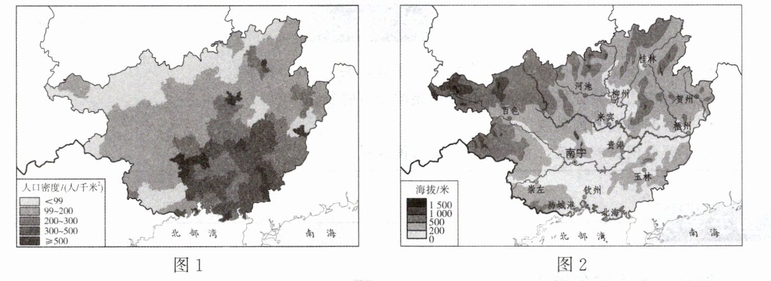人口的分布状况深受地理环境的影响。图 1 为广西壮族自治区人口密度分布示意图,图 2 为广西壮族自治区地形和主要河流分布示意图。请据此开展探究。