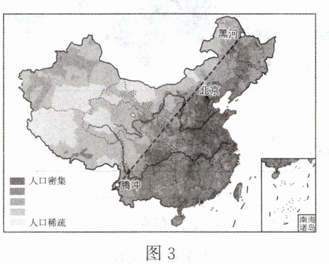 20 世纪 30 年代,地理学家胡焕庸绘制了中国人口密度图,提出了黑河—腾冲人口地理界线,该线被称为“胡焕庸线”。这条分界线揭示了中国人口分布的基本格局。图 3 为胡焕庸线示意图。