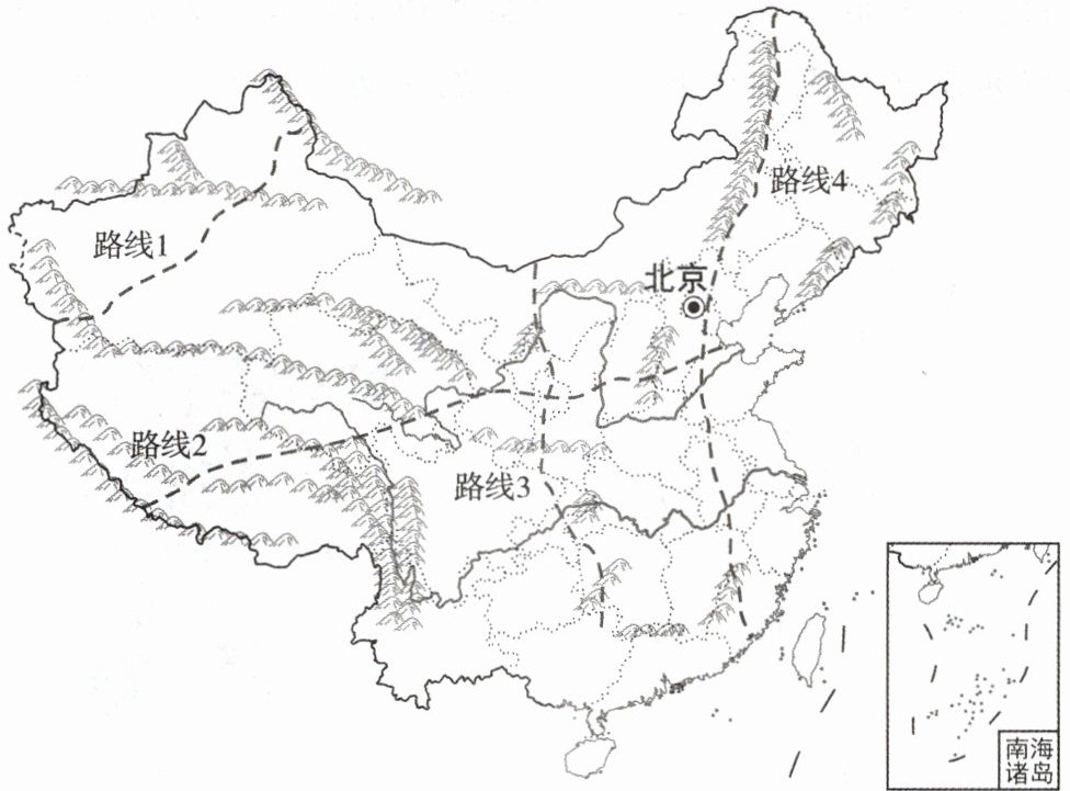 (1) 在路线 1 中,经过一座白雪皑皑的天山,天山脚下聚居着一个能歌善舞的民族,这个民族所在省级行政区的全称是