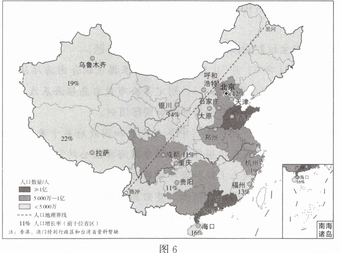 (3)我国各省级行政区人口总数存在差异。图6中人口超过1亿的省级行政区是